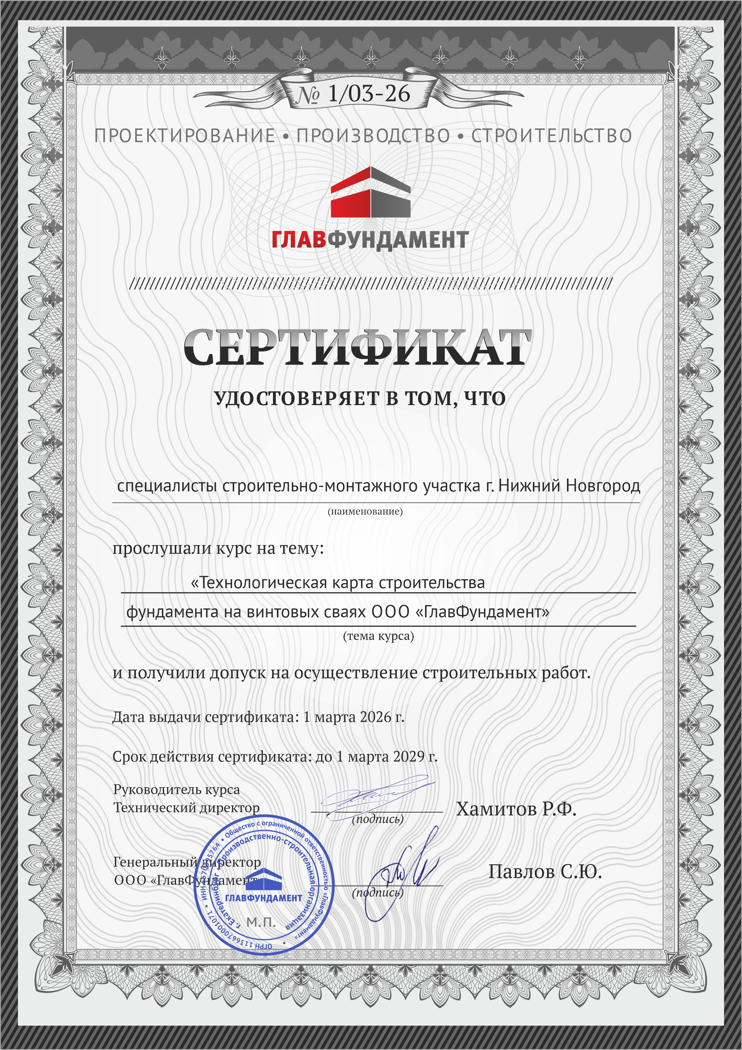 • Гарантийный сертификат на 25, 50 и более лет (после выполнения расчета срока службы, изучения геологических условий в Нижнем Новгороде в пятне застройки и измерения коррозионной агрессивности грунтов).